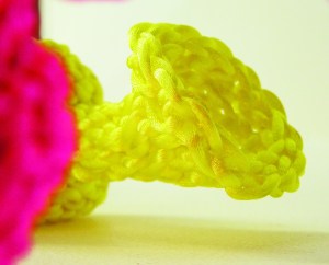 As a process of iteration and repetition, crochet begins with a slip knot and involves creating a series of loops using a hooked needle, altering the topology of the original material from a simple length into a complex three dimensional form. Fascination with the ability to control and manipulate these materials has driven my practice, resulting in ‘mutations’ of traditional crochet stitches. Although techniques like crochet were almost abandoned due to the introduction of modern manufacturing, crochet has retained its thrifty nature and developed into a sophisticated craft.